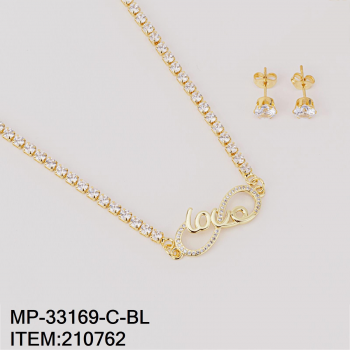 Juego de Collar y Aretes con Diseño de Infinito con Piedras Blancas y Frase LOVE en Chapa 14K