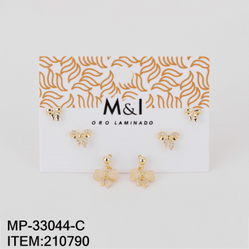 Arete Broquel con Juego de 3 Pares con Diseño de Flores Blancas y Cadenita en Chapa 14k